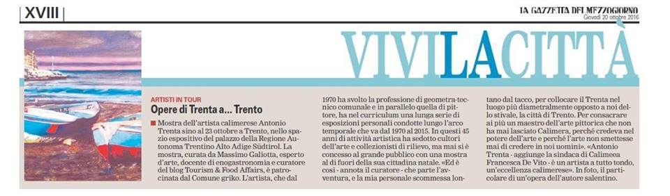 Dal 10 al 23 Ottobre 2016, si terrà a Trento, presso lo spazio espositivo del palazzo della Regione Autonoma Trentino Alto Adige Südtirol, una mostra dell’artista salentino Antonio Trenta che, ininterrottamente, dal 1970 ha svolto la professione di Geometra/Tecnico comunale e in parallelo quella di pittore nella sua ellenofona Calimera, in provincia di Lecce.