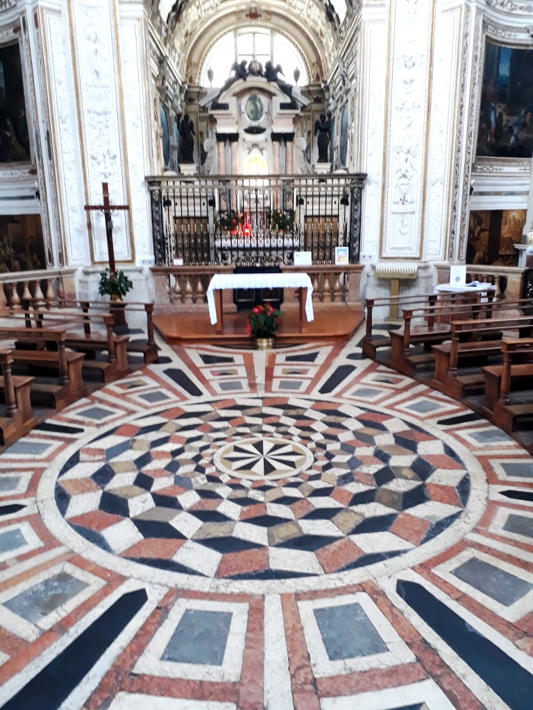 In effetti la parte esterna dell’edificio, si potrebbe definire, perché anticipatrice dei tempi futuri, di “avanguardia”, se mi permettete di sdoganare una definizione dal sapore Novecentista; in effetti l’architettura sembra ispirata, nella sua concezione d’insieme, dal Neoclassicismo palladiano che all’inizio del secolo XVIII avrebbe condizionato le architetture d’Europa e del “Nuovo Mondo”. Eppure se si prova a indagare nella letteratura prodotta ci si scontra con un semplicistico “tra le più belle chiese barocche del Trentino”. Purtroppo non è solo questo, la chiesa della Beata Vergine Inviolata (BMV Inviolata Church, scrivono sull’opuscoletto dedicato) è molto di più. In questo luogo il Sacro ed il profano (l’aggettivo pagano è stato ragionevolmente escluso perché non risponde pienamente a tutti i significanti celati al suo interno) si incontrano, contemporaneamente, come se l’uno non escludesse l’esistenza dell’altro. Il motivo è prettamente storico.