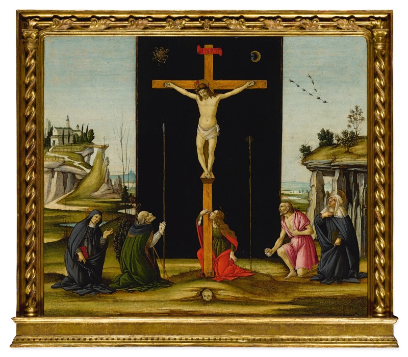 «Databile intorno al 1495-1505, questa tavola, ben conservata, illustra una “crocifissione mistica” e fu dipinta nell’ultima parte della carriera di Botticelli. Il noto critico Federico Zeri la riconosce come tale nel 1959 attribuendone la paternità a Sandro Botticelli, probabilmente con il contributo di qualche allievo della sua bottega. Al momento della vendita nel 2003[1] (Provenienza purtroppo anonima) Everett Fahy si trova d’accordo con il punto di vista di Zeri, sebbene non fosse in grado di identificare alcun dettaglio specifico completato da una mano diversa da quella di Botticelli. L’opinione scritta di Fahy è ancora oggi confermata dagli studiosi, incluso il dottor Laurence B. Kanter, che, a seguito di un’ispezione di prima mano, considera questa opera autografa di Botticelli e la fa risalire al 1500-1505 ca.[2]. La composizione molto originale, ravvivata da una ricca tavolozza di colori e intrisa di intensità emotiva, mostra Cristo in croce, circondato da cinque santi inginocchiati in adorazione, ciascuno reso con struggente individualità. Maria Maddalena, premendo la guancia contro la croce, guarda in alto mentre una sola lacrima le cade sul viso. Vestita di nero come una suora agostiniana, Santa Monica e suo figlio Sant’Agostino compaiono a sinistra, mentre a destra sono San Girolamo penitente e Santa Brigida di Svezia, a cui viene dato maggior risalto rispetto agli altri santi. La sua inclusione suggerisce che il committente del dipinto potrebbe essere stato collegato ai “Brigidini”, ordine monastico fondato dalla Santa che segue la regola di Sant’Agostino. Significativa in questo contesto la chiesa arroccata sullo sperone roccioso in alto a sinistra, che ricorda il convento di Santa Brigida, alle porte di Firenze. Nel corso della sua vita, Santa Brigida, una devota nobildonna legata alla corte svedese, ha sperimentato numerose visioni di Cristo, tra cui una di lui in croce circondata dai simboli della Passione. Ha registrato queste visioni in un libro di Rivelazioni, che qui tiene nella mano sinistra».