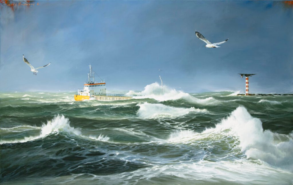 Du 4 decembre 2021 au 29 janvier 2022, chez Sakah Galerie à Toulouse, sont exposées les oeuvres du peintre Dirk Verdoorn (Dordrecht, Hollande, 1957), Maître d’un certain hyper-symbolisme figuratif qui n’appartient qu’à lui: dont “sa caractéristique la plus authentique est la capacité unique d’humaniser le métal froid des coques de ses navires. Ses cargos, ses porte-conteneurs, ses remorqueurs, sont vivants, faits de chair et de sang. Des navires solitaires semblables à des hommes solitaires, abandonnés à la tempête, lèvent la tête avec résignation, émergeant des flots comme s’ils étaient des caravanes bédouines solitaires, parmi les dunes d’un désert d’eau profond et sourd” (Cit. Puglia&Mare, settembre 2021). Voyager romantique, avec ses tableaux nous montre son regard sur le dramme contemporaire de l’homme: sur la solitude qui nous vivons, jour le jour. Dans ses tableaux, chaque sujet explique la manière d’affronter les événements; pour Verdoorn la vie n’est pas facile mais elle doit être vécue avec courage, et comme ses peinture sera une image indélébile pour l’éternité.