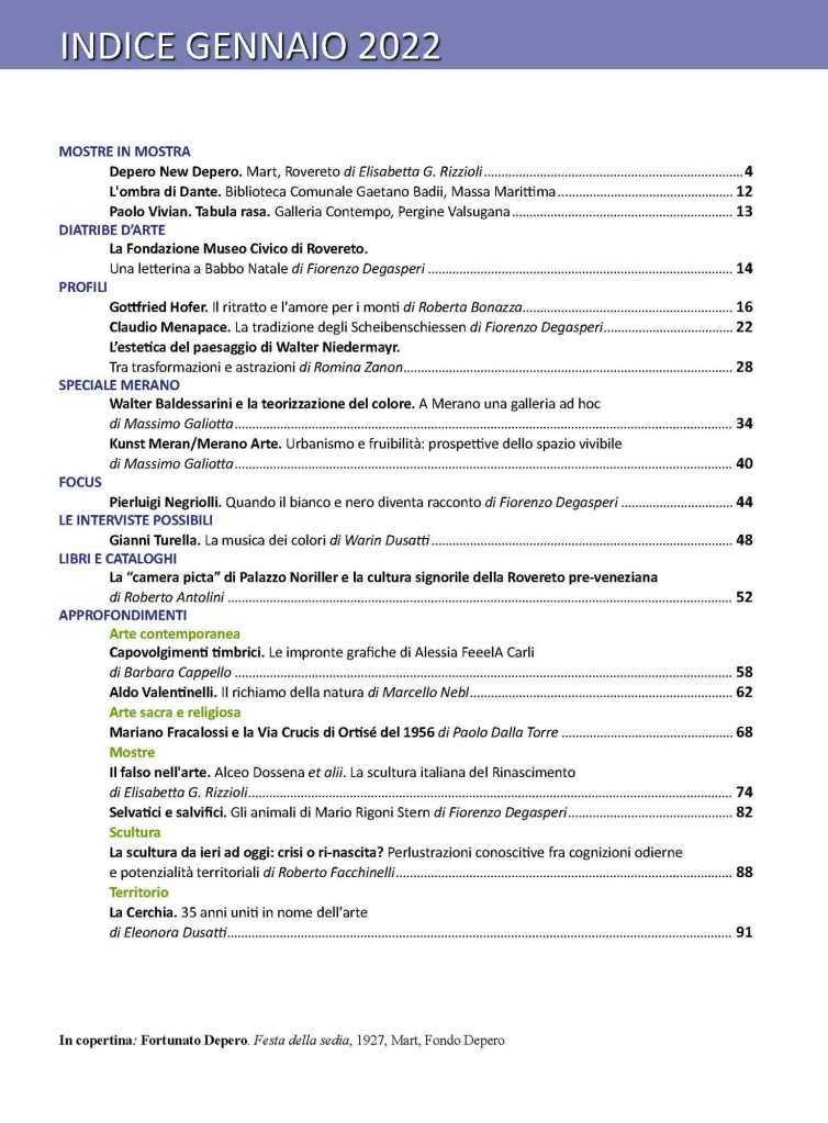 La veste grafica è come sempre speciale: dedicata alla grande mostra in corso al MART Depero New Depero, già annunciata in questa sede nei primi mesi dell’anno scorso, approfondita dalla delicata penna di Elisabetta G. Rizzioli. Oltre la copertina sono molti i titoli da non perdere; tantissimi approfondimenti al cui centro c’è l’uomo e l’espressione artistica: dalle ormai consuete Diatribe d’arte di Fiorenzo De Gasperi, che firma l’articolo «La Fondazione Museo Civico di Rovereto. Una letterina a Babbo Natale», ai Profili di Gottfried Hofer e Walter Niedermayr, firmati rispettivamente da Roberta Bonazza e Romina Zanon, tutti autori, sin dalla prima ora, dell’elegante magazine.
