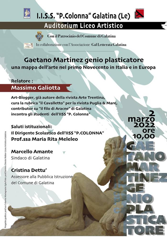 L’evento dedicato al genio plasticatore di Galatina torna, con un secondo appuntamento necessario, fisiologico: dopo la ricorrenza dello scorso 2021 (il settantesimo anniversario della morte), quest’anno ricorre il 130° dalla nascita dell’artista. L’incontro in memoria di Gaetano Martinez (Galatina, 1892-Roma, 1951) non è una conferenza fine a sé stessa ma un esperimento didattico perfettamente in linea con il principio dell’apprendimento attivo, coinvolgente, secondo strategie comuni alla “buona scuola” di oggi. Dunque non una conferenza ma un workshop in cui gli alunni del Liceo Artistico di Galatina proveranno a cimentarsi con un modello nuovo, confrontandosi con un mondo dell’arte ancora oggi impantanato tra sfera accademica e cono d’ombra della non-accademia: una cultura mediocre fatta di orticelli che ognuno di noi coltiva ancora sotto i condizionamenti di una “sindrome dello scolaro” mai sradicata. Eppure oggi serve altro. È necessario avviare processi di personizzazione anche sul “pianeta arte”, ossia «la costruzione di relazioni che permettano di portare a termine un lavoro impedendo l’indifferenza, la manipolazione […] la menzogna e l’omissione che così spesso abitano i rapporti professionali» (Schein & Schein, 2019).