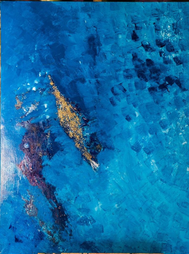 Astratto: «Ogni dipinto è come un tuffo nel mare, sai dove stai per immergerti ma non saprai mai dove arriverai a compimento dell’opera d’arte»[4]. Il Tableau in questione, una tecnica mista su tela (acrilico e polvere d’oro), nato con tutt’altro intento, evoca in chi lo guarda un sentimento di infinito, di profondità marine e di trasparenze popolate da grandi creature natanti. Gli azzurri, i blu, i turchesi, riconducono per forza all’enorme distesa d’acqua che ci circonda. Le pennellate larghe, la spatola usata per stendere la materia in forme incompiute, volutamente indefinite, lasciano spazio a chi guarda di ridefinire, ricodificare, una narrazione non completamente descritta. Spiego meglio: quando Gioacchino Toma presentò il suo Viatico dell’orfana (Esposizione Nazionale napoletana del 1877), tenne volutamente fuori dalla narrazione i due soggetti principali, l’orfana morente sul lettino a sinistra e il prete in processione con il viatico sulla destra, entrambi fondamentali eppure si intravedono appena. Toma non racconta tutto, lascia a noi l’interpretazione. Questo approccio, seppure con mezzi e risultati diversi, opposti al verismo tomiano, dimostra la volontà di Fabiana Luceri di non frapporsi tra il dipinto e l’osservatore, ne rimane fuori; anche lei, come Toma, narra in terza persona, raccontando una storia che lascia spazio a noi che guardiamo le sue opere di interpretarne il senso: in altre parole Fabiana Luceri ci dice «l’opera non è mia, …è vostra». Questo principio rende ancora oggi immortali numerosi capolavori, quelli di grandi maestri del passato, proprio come quelli del concittadino Gioacchino Toma: il parallelismo dunque non è arbitrario.