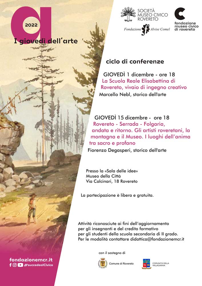 La redazione di Arte Trentina è lieta di segnalare il ciclo di conferenze dedicate agli artisti lagarini del ‘900, organizzate dalla Fondazione Museo Civico di Rovereto. Un doppio appuntamento con due degli autori e componenti del Comitato revisore della rivista: il primo incontro, giovedì 1 dicembre, La Scuola Reale Elisabettina di Rovereto, vivaio di ingegno creativo, sarà tenuto da Marcello Nebl; il secondo invece, Rovereto – Serrada – Folgaria, andata e ritorno. Gli artisti roveretani, la montagna e il Museo. I luoghi dell’anima tra sacro e profano, sarà tenuto da Fiorenzo Degasperi. La sede scelta, dalla già citata Fondazione Museo Civico, sarà la «Sala delle idee» presso il Museo della Città, al civico 18 di Via Calcinari. «Le attività sono riconosciute ai fini dell’aggiornamento per gli insegnanti e del credito formativo per gli studenti della scuola secondaria di II grado».