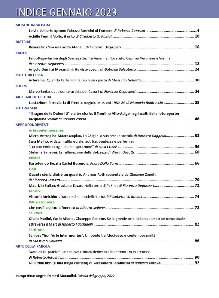 L’indice del nuovo magazine è come di consueto piuttosto nutrito: apre la rubrica MOSTRE IN MOSTRA con l’articolo di Roberta Bonazza Le vie dell’arte aprono Palazzo Rosmini al Frassem seguito da quello di Elisabetta G. Rizzioli dedicato alle mostre in corso al Mart, in particolare quella dedicata ad Achille Funi. Il Volto, il mito. Torna anche la rubrica DIATRIBE in questo numero firmata dal noto critico d’arte Fiorenzo Degasperi, Rovereto: c’era una volta Atene… , che per la sezione intitolata PROFILI firma anche l’articolo La bottega-fucina degli Scanagatta. Tra Verenna, Rovereto, Caprino Veronese e Vienna. E’ invece di Gabriele Salvaterra l’interessante contributo a proposito di Angelo Demitri Morandini. Ho visto cose…