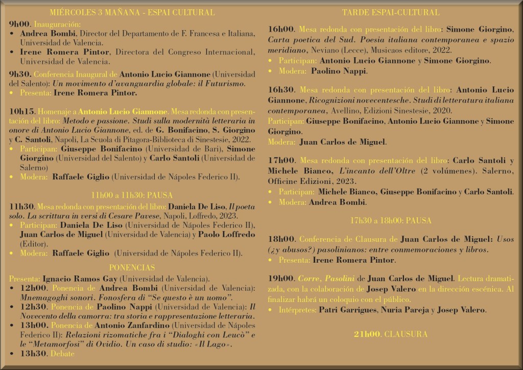 Comité Científico Internacional • Juan Carlos de Miguel y Canuto, Universidad de Valencia • Yolanda Estreder Ortí, Universidad de Valencia • Antonio Lucio Giannone, Universidad del Salento • Raffaele Giglio, Universidad de Nápoles Federico II • Ignacio Ramos Gay, Universidad de Valencia • Irene Romera Pintor, Universidad de Valencia Organiza Irene Romera Pintor. UD de Filología Italiana. Departamento de Filología Francesa e Italiana, Universidad de Valencia.