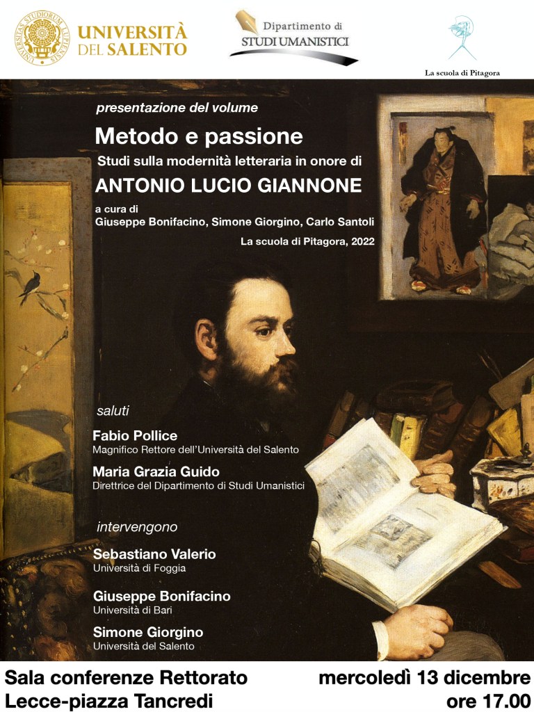 Mercoledì 13 dicembre alle ore 17:00, presso la sala conferenze del Rettorato dell’Università del Salento, sarà presentato Metodo e passione. Studi sulla modernità letteraria in onore di Antonio Lucio Giannone, a cura di Giuseppe Bonifacino, Simone Giorgino e Carlo Santoli, La scuola di Pitagora Editrice, 2022.