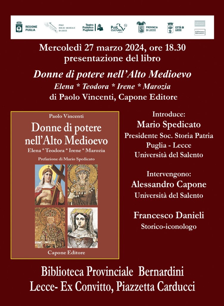 Mercoledì 27 marzo 2024, alle 18.30, Paolo Vincenti, docente e scrittore, presenta il suo ultimo libro: Donne di potere nell’Alto Medioevo – Elena | Teodora | Irene | Marozia, Capone Editore, Lecce, 2024.