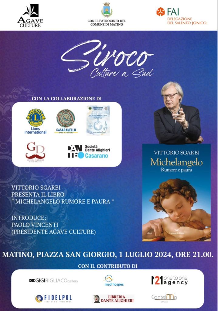 Per il terzo appuntamento della rassegna letteraria Siroco. Culture a Sud 2024, l’associazione AGAVE CULTURE Aps presenta una serata evento nella centrale Piazza San Giorgio di Matino, che vedrà la presenza di VITTORIO SGARBI con una lectio magistralis su MICHELANGELO BUONARROTI. La manifestazione, organizzata in collaborazione con la delegazione FAI SALENTO JONICO, con il patrocinio del Comune di Matino, si terrà il 1 luglio 2024 alle ore 21. Dopo l’Introduzione di Paolo Vincenti (Agave Culture) e Virgilio Provenzano (FAI Salento Jonico), il noto critico d’arte intratterrà i presenti illustrando i contenuti del suo libro dedicato al genio universale della pittura Michelangelo. Partner della serata le associazioni culturali Circolo Culturale D’Annunzio di Casarano, Lions club Casaranello “Arte e Cultura”, Società Dante Alighieri di Casarano, Libreria Dante Alighieri Casarano e Agenzia 121 Agency.