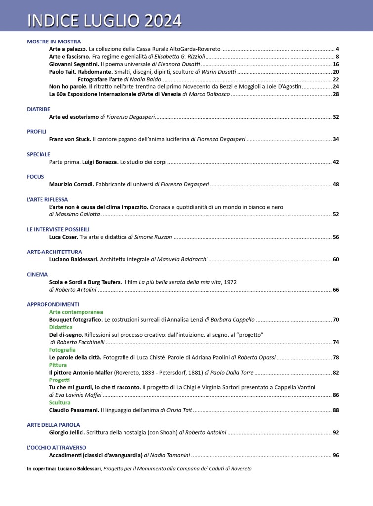 In questo numero, oltre alle consuete rubriche, è presente uno speciale, scritto da Beatrice Pasiri, dedicato a Luigi Bonazza diviso in tre parti che si concluderà con il numero di gennaio 2025, in coincidenza con l’anniversario della morte del Maestro, avvenuta nel 1965.