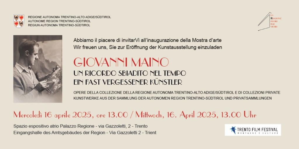 Dal 16/04/2025 fino al 23/05/2025 presso gli spazi del Palazzo della Regione, Via Gazzoletti, 2 a Trento sarà allestita la mostra “Giovanni Maino un ricordo sbiadito nel tempo”, voluta dalla Regione Autonoma Trentino-Alto Adige/Südtiro e curata da Giuseppe Tasin, in collaborazione con Franco Cortelletti e Marco Patton.