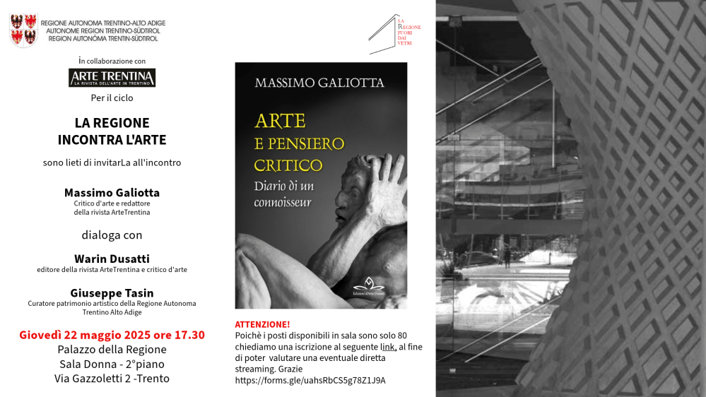 Giovedì 22 maggio alle ore 17.30 presso il Palazzo della Regione avrà inizio un ciclo di incontri dal titolo “La Regione incontra l’arte”. Il primo incontro è dedicato all’ultima fatica letteraria di Massimo Galiotta, critico e redattore della rivista Arte Trentina. Con lui dibatteranno Warin Dusatti, direttore della rivista, e Giuseppe Tasin, curatore patrimonio artistico della Regione Autonoma Trentino-Alto Adige/Südtirol. .