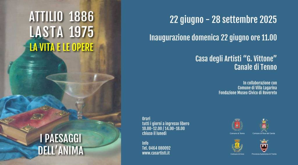 Apre domenica alle 11 alla Casa degli Artisti G. Vittone a Canale di Tenno la seconda Mostra del progetto espositivo diffuso “Attilio Lasta, 1886-1975. La vita e le opere” realizzato su tre sedi in omaggio al Pittore nato a Villa Lagarina, a cinquant’anni dalla sua scomparsa. L’iniziativa è promossa dal Comune di Tenno, dal Comune di Arco e dal Comune di Riva del Garda (che insieme gestiscono la Casa degli Artisti), in collaborazione con la Fondazione Museo Civico di Rovereto, il Comune di Villa Lagarina e la Provincia autonoma di Trento. Un progetto diffuso per far conoscere la raffinata attività pittorica di Attilio Lasta attraverso un centinaio di opere, molte delle quali esposte per la prima volta al pubblico, che rendono il giusto tributo a un artista dimenticato.