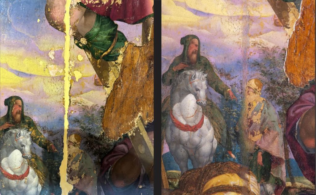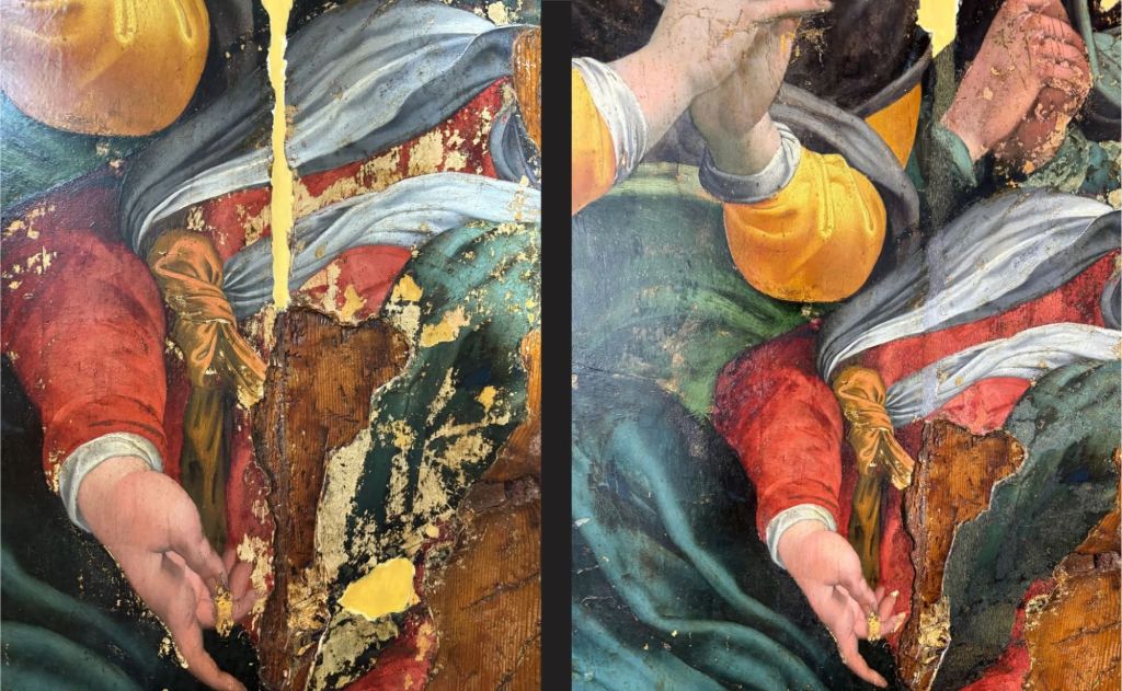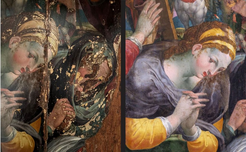 L’intervento di restauro ha previsto la PULITURA SELETTIVA della superficie pittorica originale, la RIMOZIONE DELLE INTEGRAZIONI NON PIÙ COERENTI, il CONSOLIDAMENTO LOCALIZZATO di preparazione e pellicola pittorica, la STUCCATURA e MICRO-STUCCATURA delle lacune e delle fessurazioni, seguite da REINTEGRAZIONE PITTORICA MIMETICA REALIZZATA A RIGATINO e da VELATURE pittoriche nelle zone dove la preparazione risultava ancora visibile.