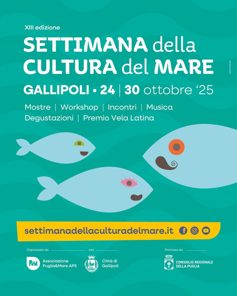 E’ quasi pronta ad aprire i battenti la XIII Edizione della Settimana della Cultura del Mare: il programma settimanale che animerà la città di Gallipoli ed il territorio circostante è denso di appuntamenti. Si comincia venerdì 24 ottobre 2025, con l’inaugurazione della manifestazione presso la Sala Ennagonale e Sala della Torretta del Castello Angioino della città.