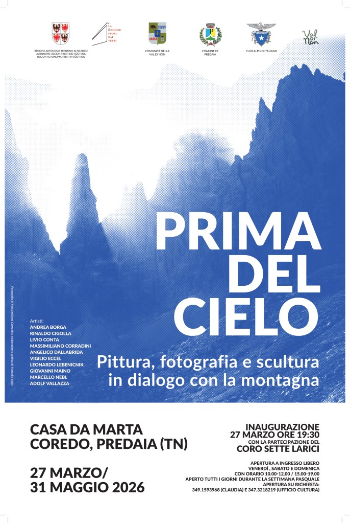 Venerdì 27 marzo 2026, alle ore 19.30, presso Casa da Marta a Coredo (Comune di Predaia), sarà inaugurata la mostra “PRIMA DEL CIELO. Pittura, fotografia e scultura in dialogo con la montagna”, con opere della Regione, di Marcello Nebl, di Andrea Borga e di Massimiliano Corradini. e visitabile fino al 31 maggio 2026.